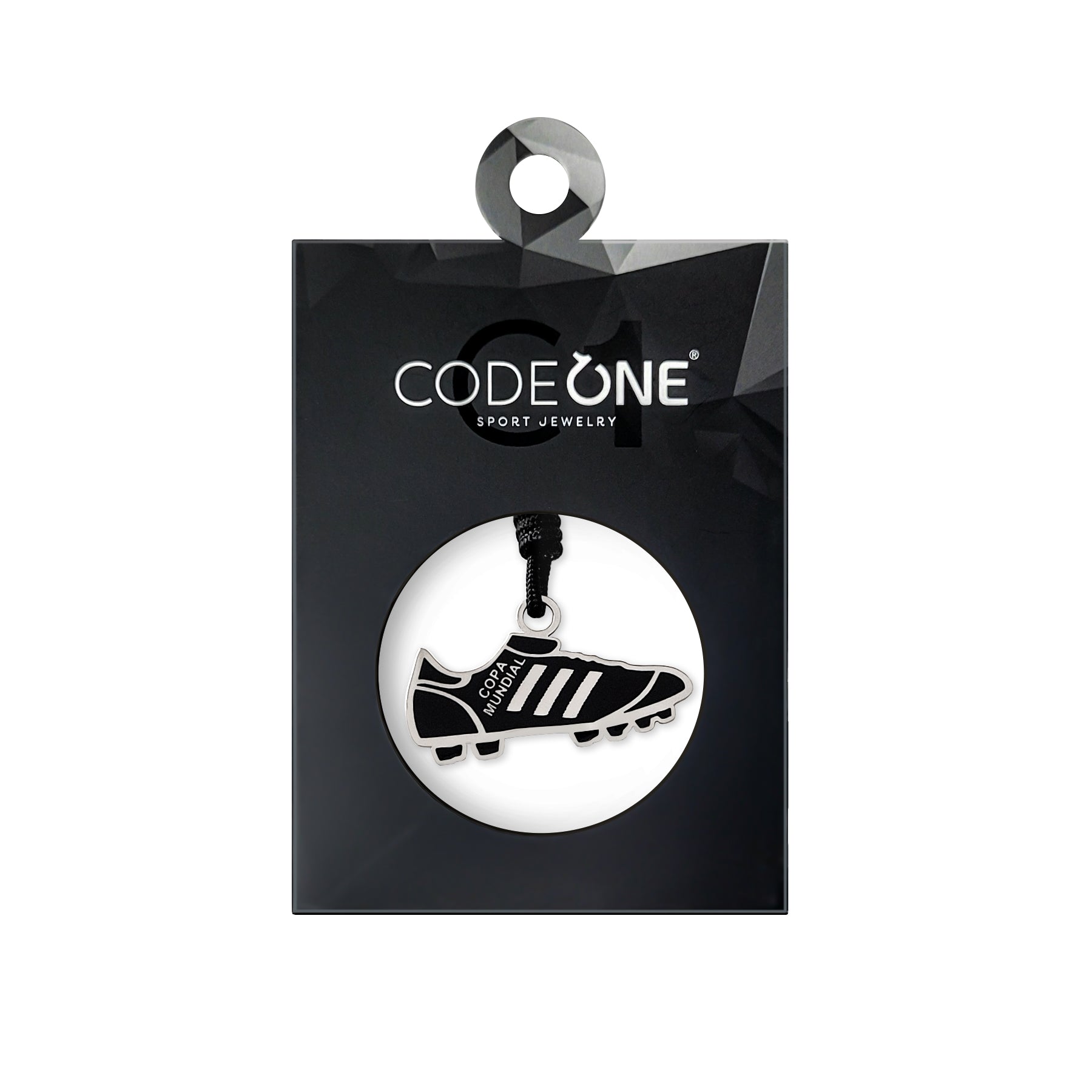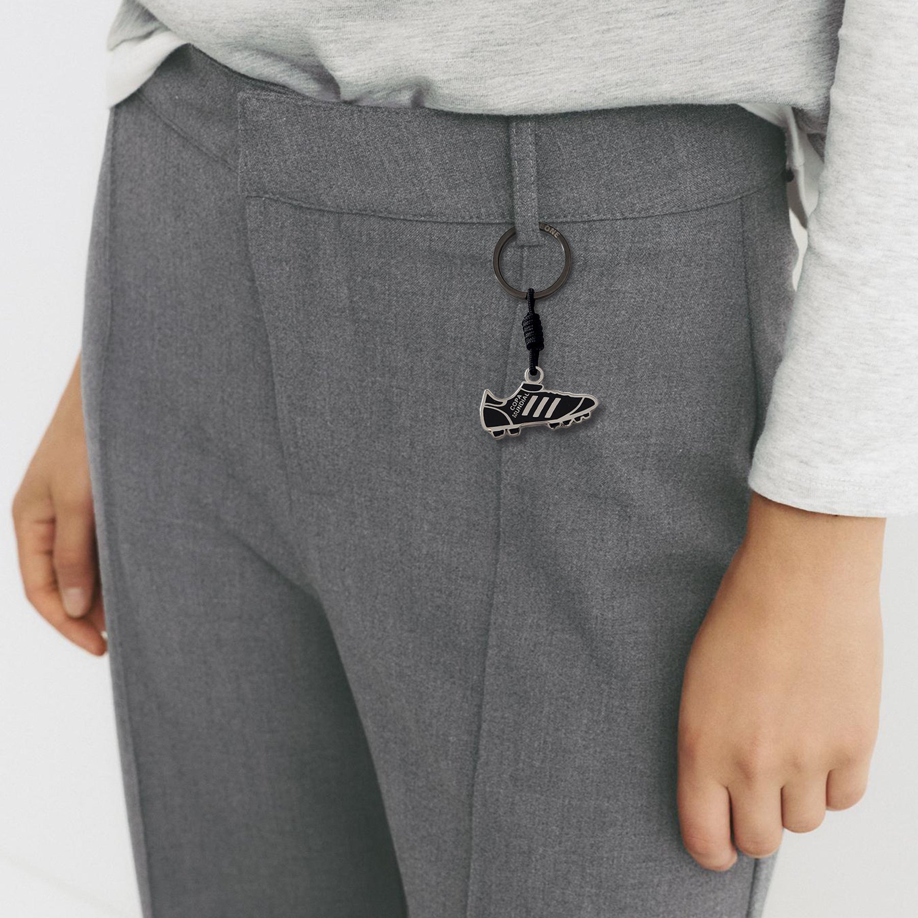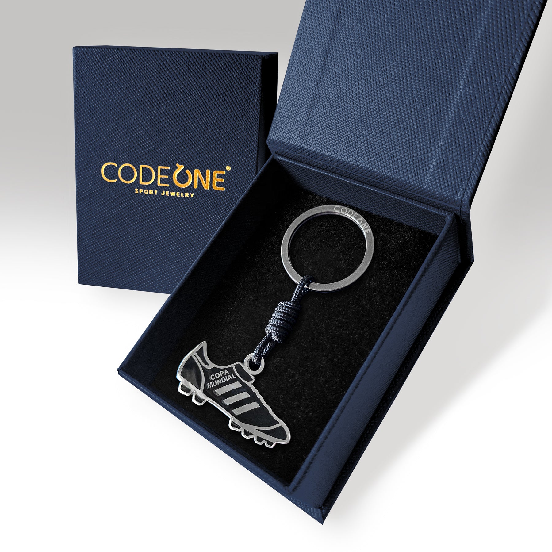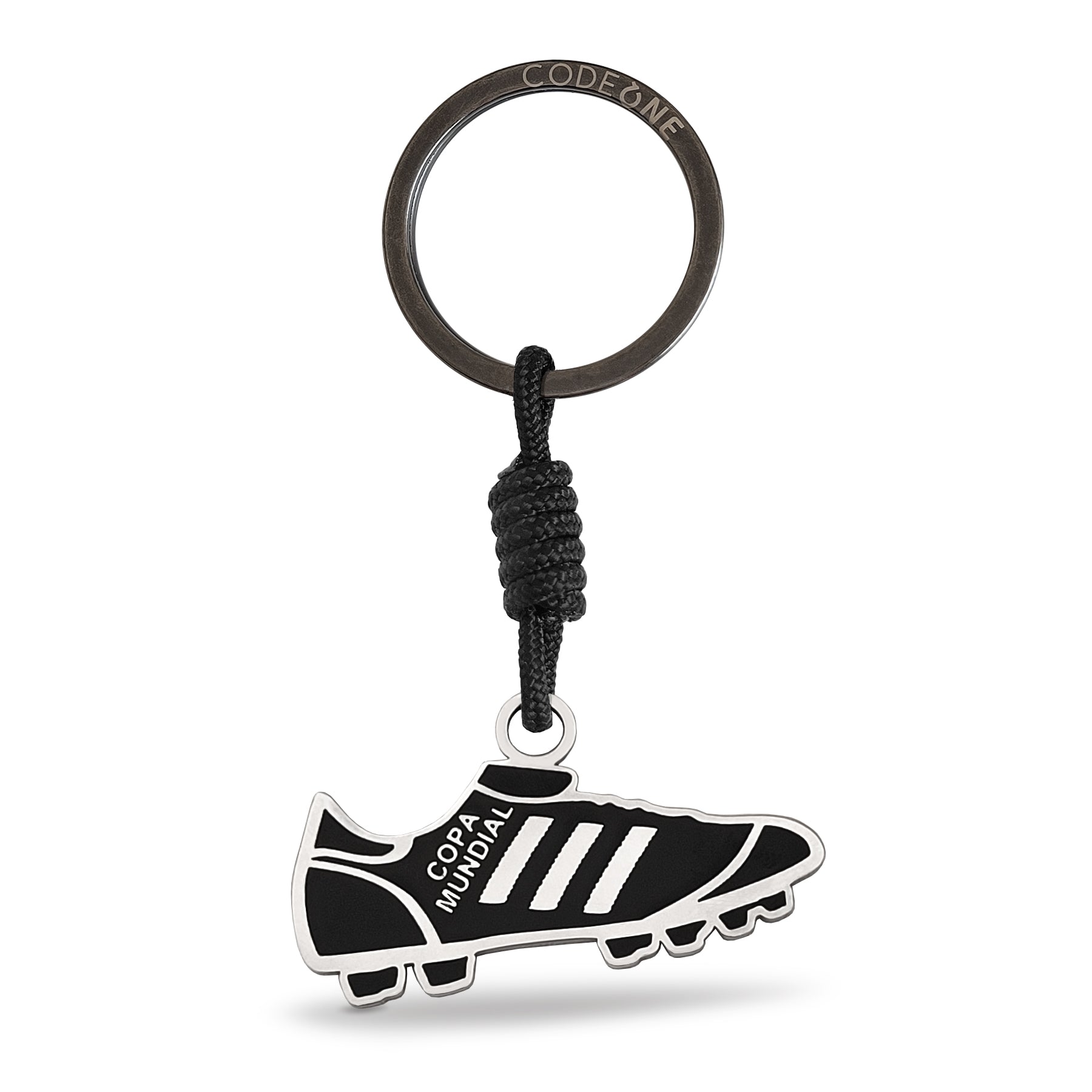LLAVERO BOTA FUTBOL fabricado en Acero Inoxidable mate, con aro color negro con logotipo de la marca grabado, y adorno de nudo con nylon de 2mm.