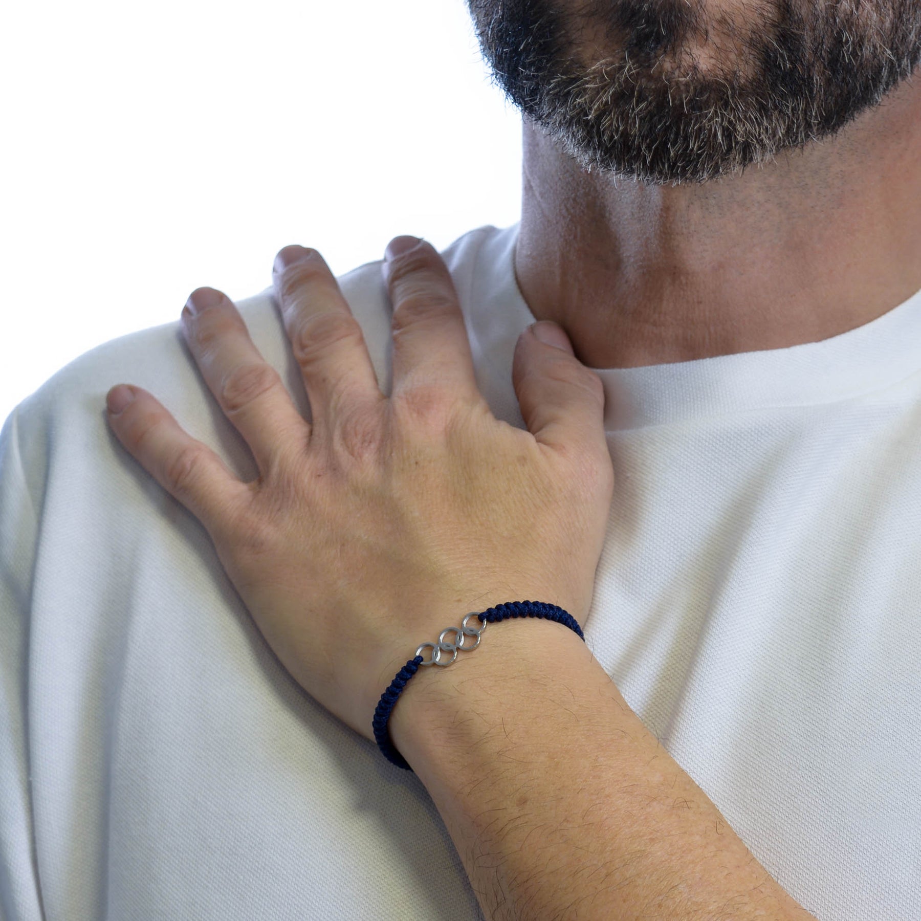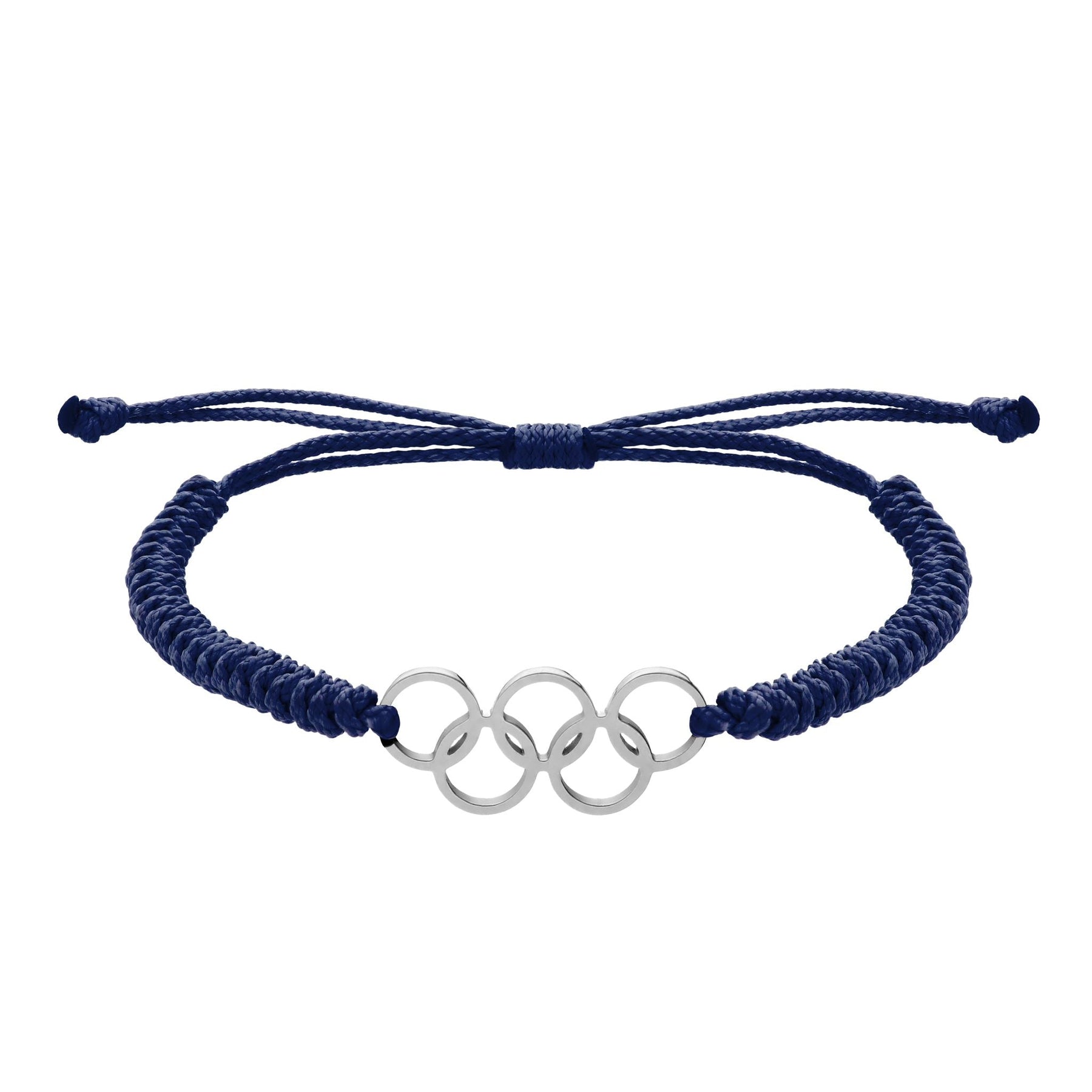 Pulsera de AROS OLIMPICOS fabricada en acero Inoxidable, con estructura cocida a mano en hilo de Nylon resistente. Con medida universal, totalmente ajustable para cualquier muñeca, con nudos corredizos.