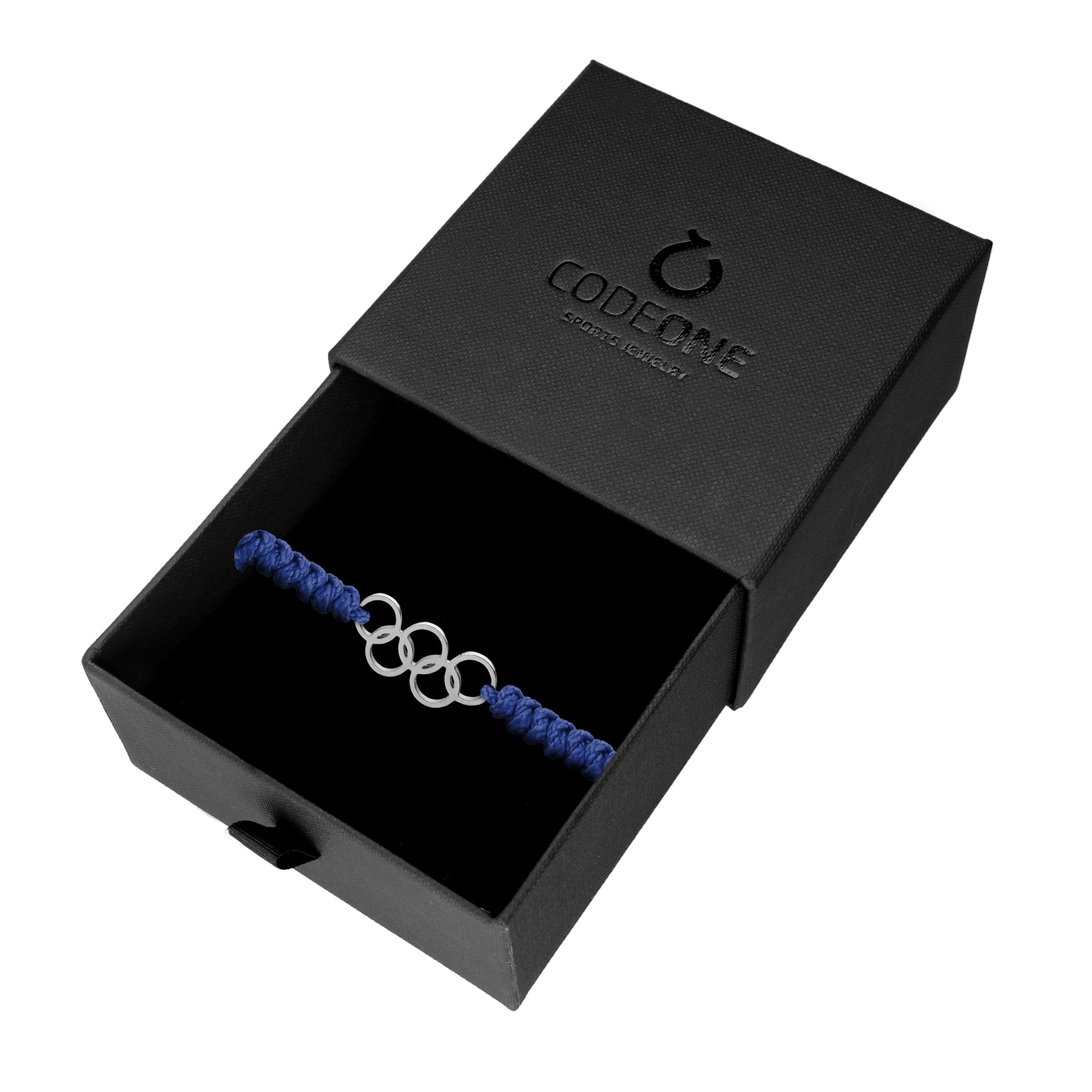 Motivos principales: AROS OLIMPICOS EN ACERO INOXIDABLE COLOR PLATA, NYLON TRANZADO COLOR AZUL. HECHO A MANO EN NUESTRA PROPIA FABRICA.