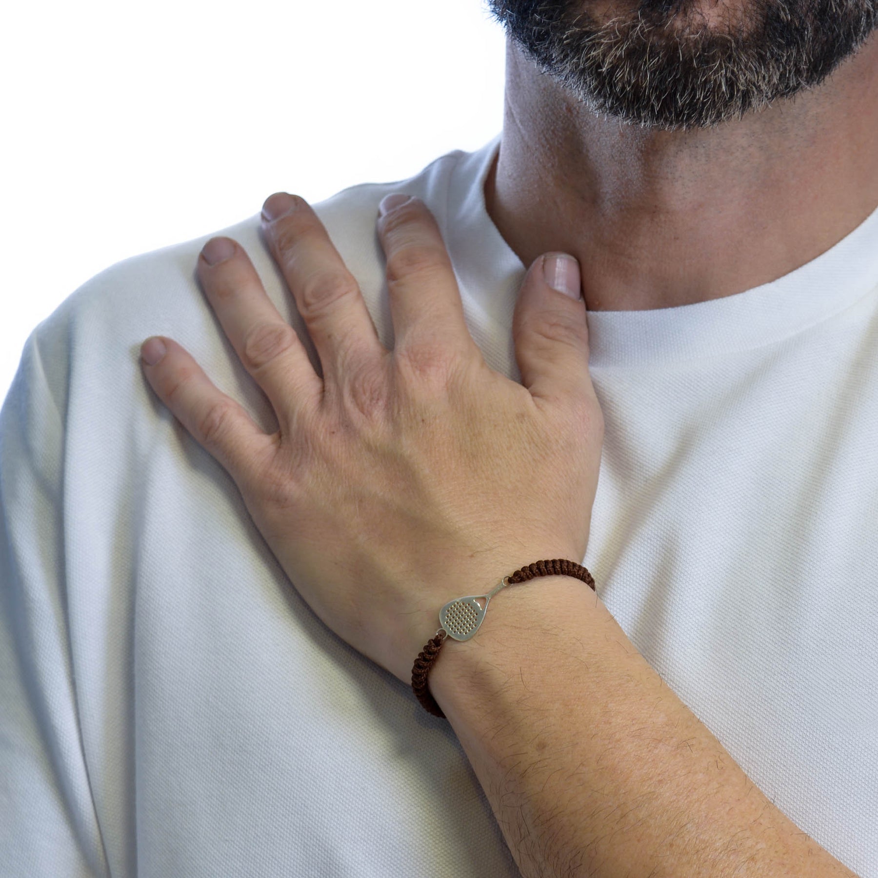 Pulsera de PALA DE PÁDEL fabricada en acero Inoxidable, con estructura cocida a mano en hilo de Nylon resistente. Con medida universal, totalmente ajustable para cualquier muñeca, con nudos corredizos.