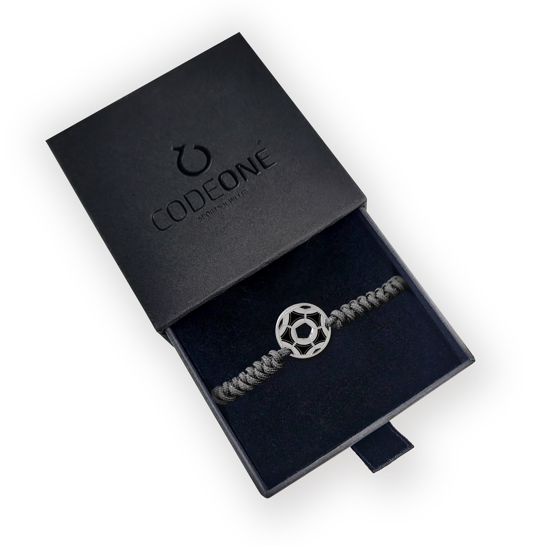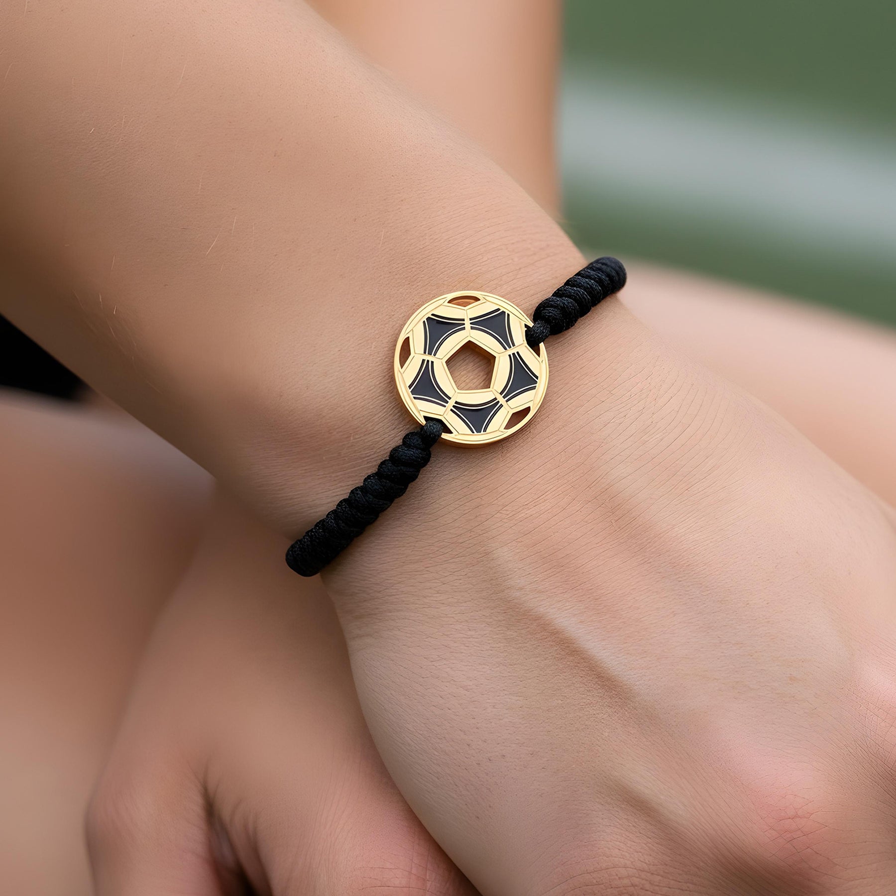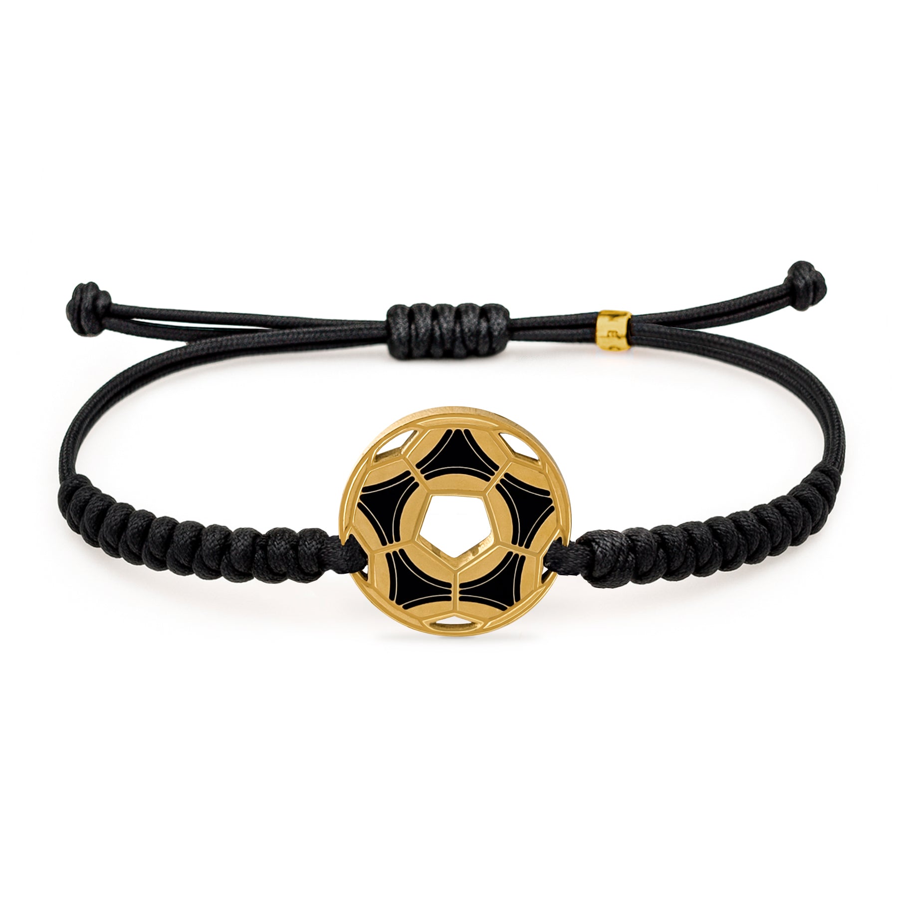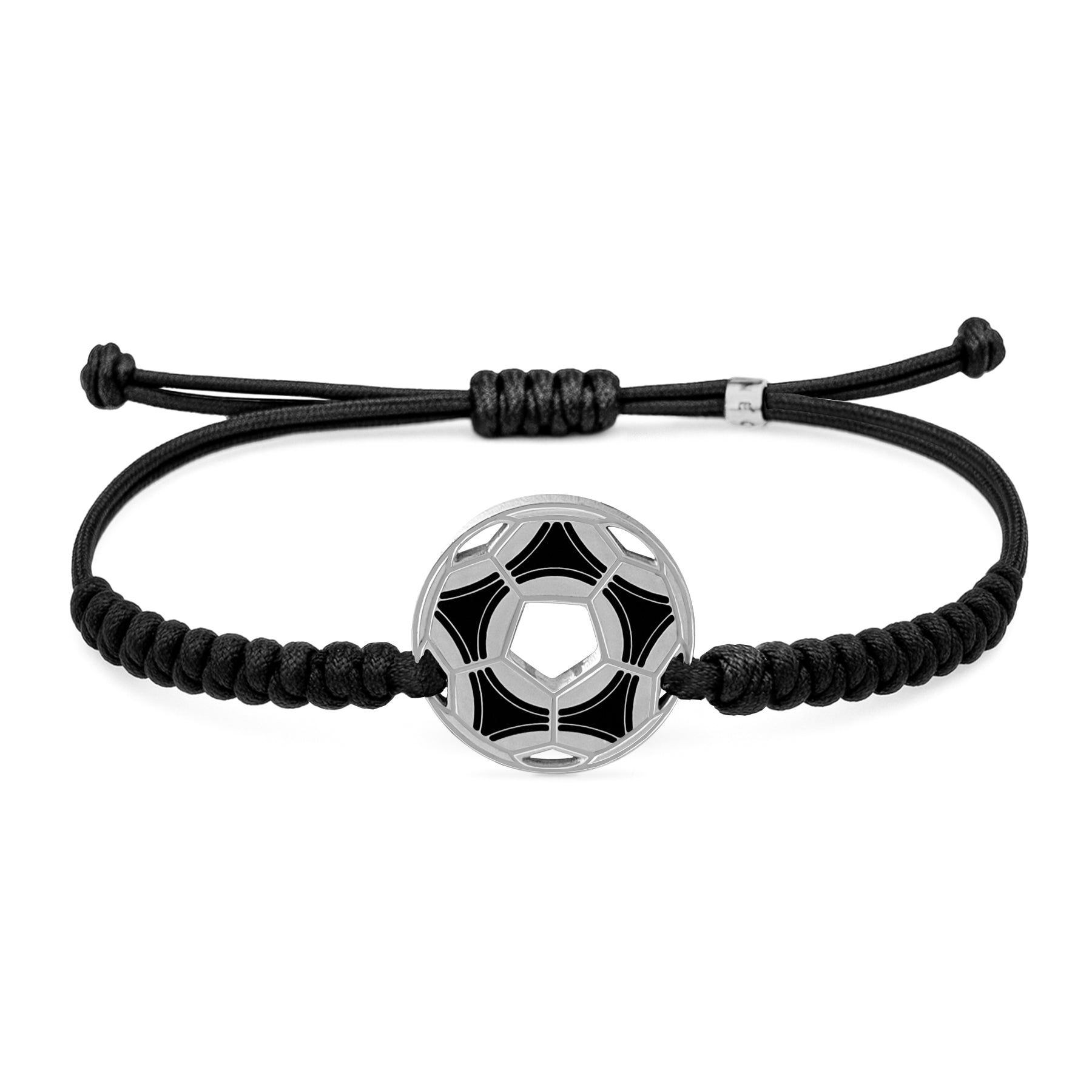 Detalles : Pulsera con silueta de balón de fútbol retro. Con nylon trenzado negro con nudo de serpiente.