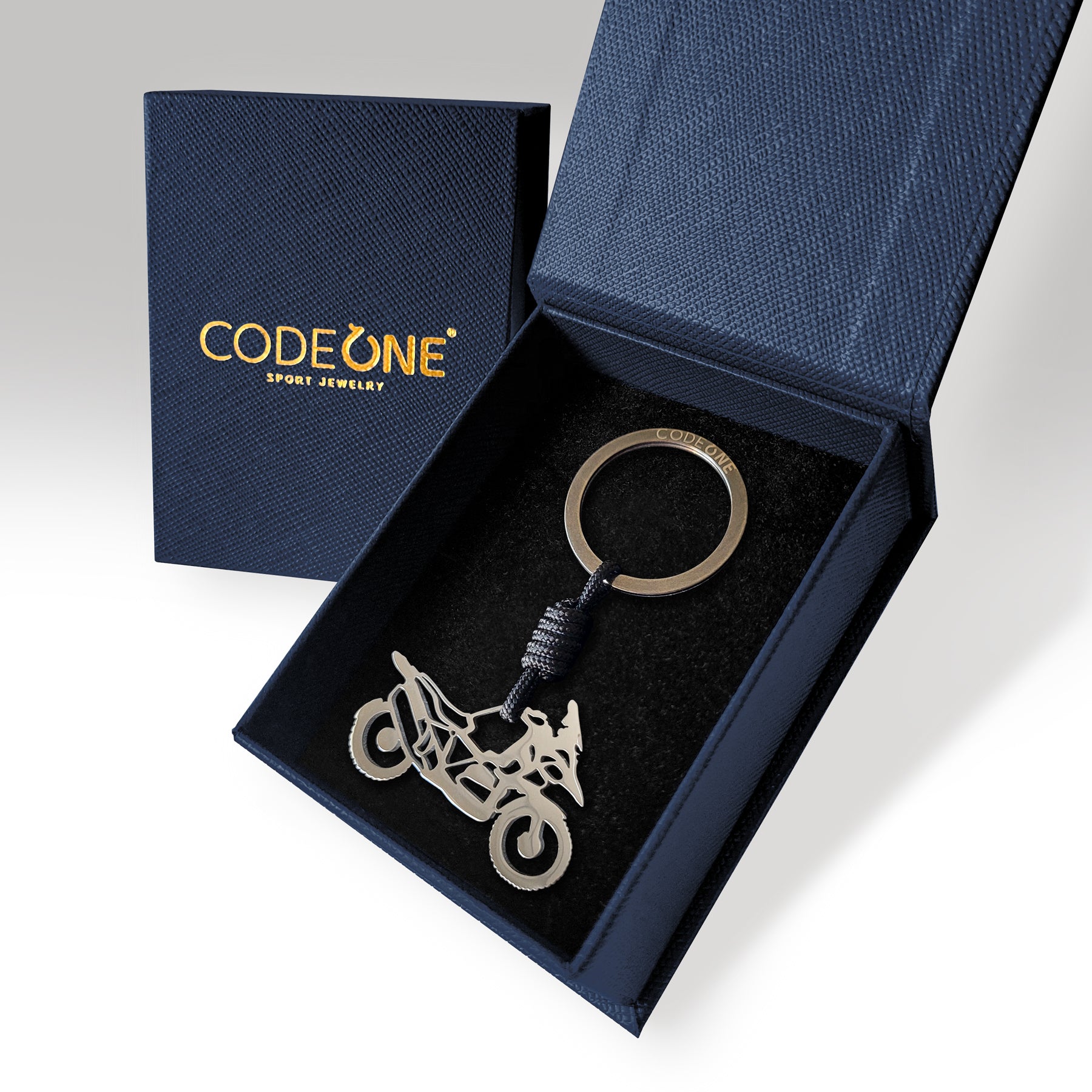 LLAVERO MOTO DE MAXITRAIL fabricado en Acero Inoxidable mate, con aro color negro con logotipo de la marca grabado, y adorno de nudo con nylon de 2mm.